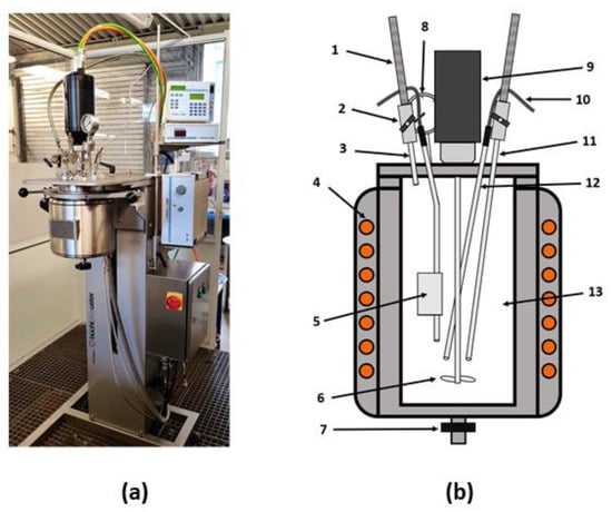 The autoclave including the peripheral device (a) and cross-section of the pressure vessel (b): 1: pressure hose; 2: needle valve; 3: exhaust; 4: stainless steel shell with heating and cooling elements; 5: thermocouple and baffle; 6: propeller; 7: bottom outlet (liquids); 8: pressure gauge; 9: motor for stirrer; 10: connection wire to interface; 11: gas inlet; 12: pressure sensor; 13: reaction space [29].