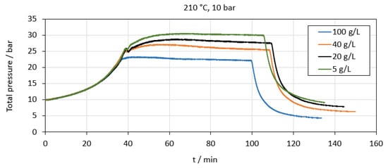 Figure 5 represents the exemplary pressure course for several alkali concentrations at 210 °C and 10 bar O2 (=total pressure). The graphs also indicate a rough shape of the temperature profile due to the correlation between temperature and pressure. The NaOH content appears to have a beneficial influence on the heat input into the solution, because solutions with more alkali reached the final processing temperature earlier. Therefore, the start of cooling was initialized earlier after the residence time as can be retraced by considering the graph for 100 g/L.