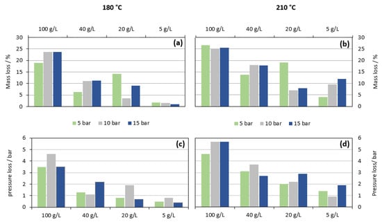 The mass loss at 180 °C/series A2 (a); the mass loss at 210 °C/series A1 (b); the pressure loss at 180 °C/series A2 (c); the pressure loss at 210 °C/series A1 (d); constants: 1 h, 800 rpm, S/L: 0.1.