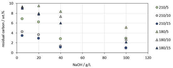 Figure 8 depicts the difference in the pH before and after leaching as well as the resulting amount of consumed alkali. The initial pH was calculated based on the known alkali concentration from the beginning. At elevated initial NaOH concentrations a considerable consumption of OH− occurred. In the case of test runs at 210 °C and 5 g/L NaOH, the alkali consumption resulted in a drop of the pH down to 8.