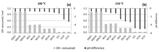 The difference in the pH and calculated consumption of OH− at 180 °C/series A2 (a) and 210 °C/series A1 (b); constants: 1 h, 800 rpm, S/L: 0.1; caption horizontal axis: NaOH conc./oxygen pressure.