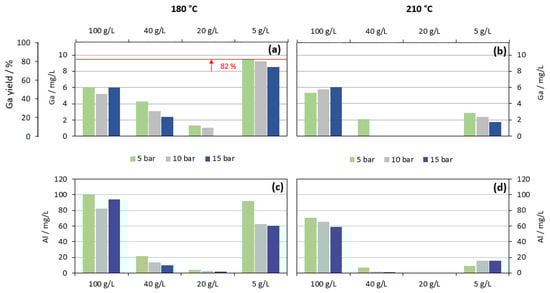 The gallium concentration in the liquor and max. yield at 180 °C (a) and 210 °C (b); the aluminum concentration in the liquor at 180 °C (c) and 210 °C (d); constants: 1 h, 800 rpm, S/L: 0.1.