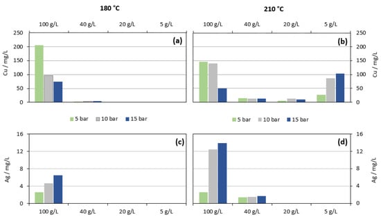 The copper concentration in the liquor at 180 °C (a) and 210 °C (b); the silver concentration in the liquor at 180 °C (c) and 210 °C (d); constants: 1 h, 800 rpm, S/L: 0.1.