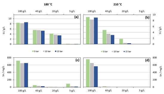 The silicon concentration in the liquor at 180 °C (a) and 210 °C (b); the tin concentration in the liquor at 180 °C (c) and 210 °C (d); constants: 1 h, 800 rpm, S/L: 0.1.