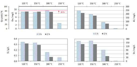 Figure 12 depicts the amounts of gallium, aluminum, silicon, and tin in the leach solution after series B. In addition, two results from series A1 (210 °C) and A2 (180 °C) were added to the diagrams to better recognize the influence of temperature. There was no experiment at 210 °C and 2 h.