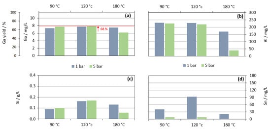 Concerning gallium, the yield slightly decreased between 120 and 180 °C and was poorly affected by the leaching time. In the case of the other shown elements, however, there was a significant increase along with the decreasing temperature and residence time. At first glance, this appears to be contradictory to general kinetics laws, however, the formation of CO2 and its neutralizing effect on alkaline solutions must be regarded. Lower temperatures also constrain the oxidation of organic carbon and, thus, the formation of CO2. If less CO2 is formed, the solution is less depleted of OH−, which apparently results in a higher solubility of Al, Si, and Sn. When a residence time of 2 h was applied, the overall reaction time was longer. Concerning this, there are two mechanisms, occurring simultaneously and working for and against metal dissolution: the leaching reaction is facilitated by high OH− concentrations, whereas the formation of CO2 results in the decrease of alkali, and, thus, inhibits metal dissolution. Both reactions are enhanced by higher temperatures.