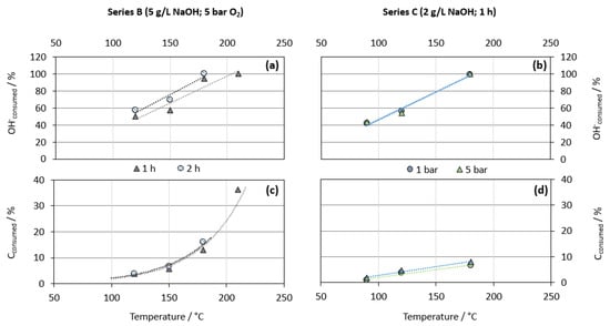 Figure 14 offers the consumption of OH− and carbon during series B and C. Applying the lowest alkali concentration of 2 g/L (Figure 14b,d) resulted in a linear increase of both carbon and NaOH consumption between 90 and 180 °C. Under these conditions, the increase of oxygen pressure from 1 to 5 bar did not have a significant influence within the full temperature range. However, when the alkali concentration was 5 g/L (Figure 14c), the relation between the carbon consumption and temperature became exponential, and the reaction time had only a small enhancing effect. In contrast, the graph of alkali consumption (Figure 14a) remained linear with a more substantial influence from the reaction time.