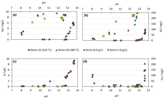 Plots for silver and tin are not shown, because they exhibited the same performance as copper. Regarding aluminum and gallium, a completely different situation was demonstrated: gallium possesses a high solubility within a wide pH range, which even exceeded the solubility area from previous calculations (Figure 2). This unexpected Ga solubility at low pH fits with the observations made by Ramos-Ruiz et al. [12]. Probably, the fate of the elements is affected by formation of organic complexes, which could not be confirmed. Apart from low pH values, the situation around pH 12.5 is remarkable for both Ga and Al. It is clear that high pH values were not required to achieve high extraction rates. Clearly, mild conditions, as set in series B and C, produced much higher extraction rates than did a harsh environment.