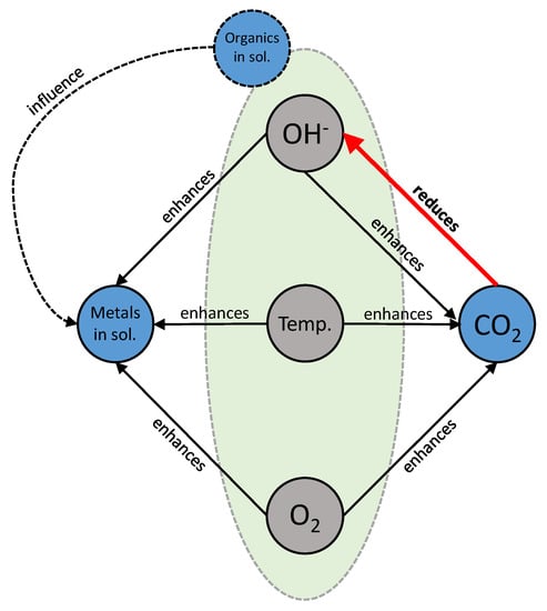 The interdependence of all leach parameters in the system is summarized graphically in Figure 16. The grey colored spots represent the initial process parameters (OH−-concentration, temperature, and O2-pressure), whereas the blue spots are associated with intermediate products (formed CO2, the amount of metals in the solution, and formed organics). As already mentioned, we assume that the formation of dissolved organics depended on the alkali concentration, temperature, and oxygen pressure, which are indicated by the green oval area. However, neither the mechanism of formation, nor the exact influence of these compounds on metal extraction could be clarified.