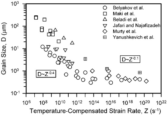 - Jafari, M.; Najafizadeh, A. Correlation between Zener-Hollomon parameter and necklace DRX during hot deformation of 316 stainless steel. Mater. Sci. Eng. A 2009, 501, 16–25. [Google Scholar] [CrossRef]