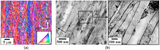- Belyakov, A.; Tsuzaki, K.; Kimura, Y.; Mishima, Y. Tensile behaviour of submicrocrystalline ferritic steel processed by large-strain deformation. Phil. Mag. Lett. 2009, 89, 201–212. [Google Scholar] [CrossRef]