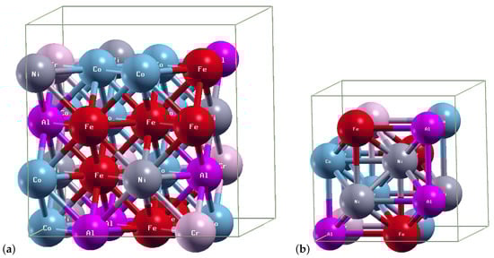 Typical supercells of Co-Cr-Fe-Ni-Al HEAs: (a) FCC structure with 32 atoms and (b) BCC structure with 16 atoms. Only the atoms belonging to one supercell (FCC/BCC) are represented.