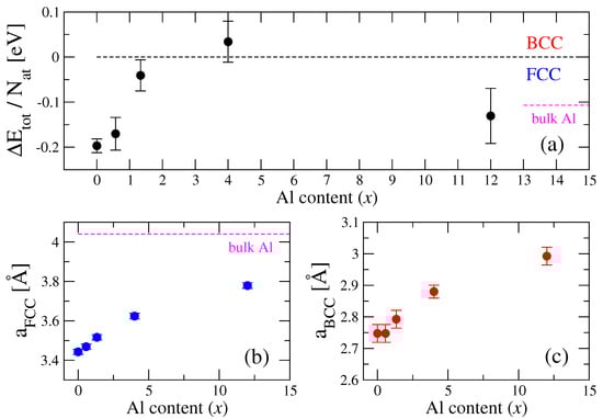 (a) Total energy difference between the FCC and BCC configurations per atom, (), as a function of Al content x, indicating the equilibrium phase. The variation of the equilibrium lattice constant with the Al content x for FCC (b) and BCC (c). The experimental value for bulk Al () is shown for reference.