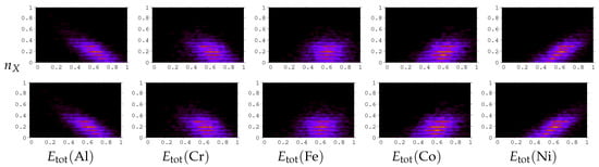 The enormous range of possible combinations poses a tough challenge from both a theoretical and experimental point of view, which makes direct exhaustive approaches rather unsuitable. Instead, the focus is on modifying and ultimately enhancing the physical properties of base alloys, e.g., CoCrFeNi alloy kernel, for adjusting the microstructure, mechanical and thermal properties. For instance, the CoCrFeNi alloy has been thoroughly investigated, particularly for its high tensile ductility and fracture toughness []. To increase the strength of the base alloy, several other CoCrFeNi-based HEAs have been considered, by including Al [] and, in addition, other transition metals like Ti [], Nb [], Mn []. Furthermore, to diversify the HEA design, changing the composition of the base elements was suggested [], which dramatically increases the number of potential alloy candidates.