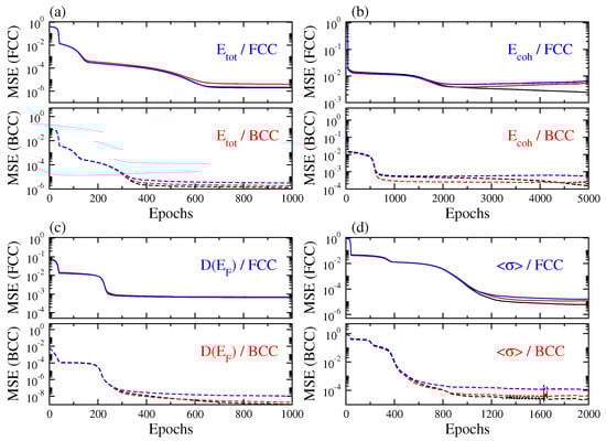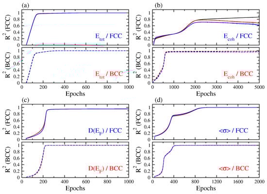 The accuracies of the ANN models, measured by , during training (black), validation (red) and test (blue), for: (a) , (b) , (c) and (d) . The data are presented for FCC (solid) and BCC (dashed) structural configurations.