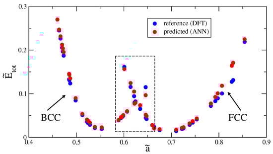 The predicted values of are presented in Figure 6, in comparison with the reference values and the equilibrium phase can be determined from the minimum energy. In this instance, a slightly lower was found, compared FCC to BCC, which is typical for this Al proportion. The obtained accuracy for the test set is , which is high enough to distinguish between the two phases. The total energy and the lattice constants have been linearly transformed, so that the new corresponding parameters and are found in . This procedure ensures a smooth convergence of the ANN model in the training process.