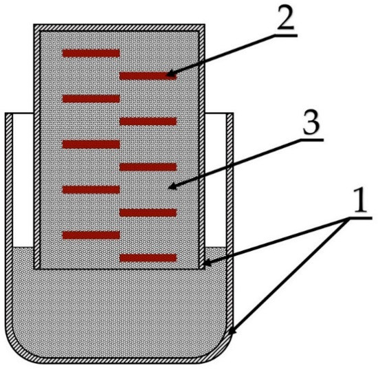 Schematic diagram of mutual arrangement of the raw materials in the roasting experiments, where 1—corundum crucibles; 2—the tablets containing red mud and sodium sulfate; 3—coal.