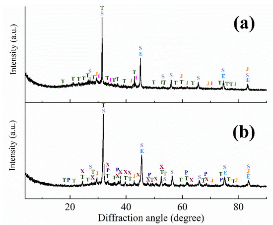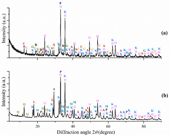 The XRD patterns of the red mud samples B (a) and U (b), where H—α-Fe2O3; K—Ca3Al2Si3(OH)12; C—Na6Ca(AlSiO4)6CO3∙2H2O; E—Al4[Si4O10](OH)8; G—Al2Ca3(OH)12; A—CaCO3 (calcite); B—(Na0.3Ca0.1K0.1)(Mn4+,Mn3+)2O4·1.5H2O; D—γ-AlOOH; P—CaTiO3; M—α-FeOOH; L—Ca(OH)2; Q—SiO2.