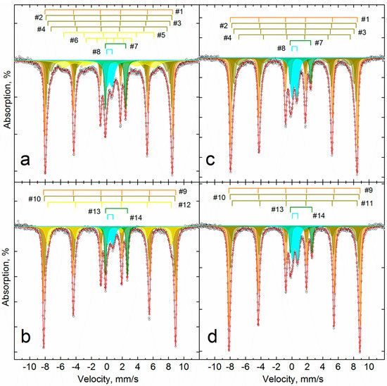 The first four sextets in the room-temperature spectra (1–4, Table 2) are common for both samples. The parameters of the sextet 1 are quite similar to the parameters characteristic for hematite [68,72]. The internal sextets 2–4 that are broader, have lower intensity and lower magnetic splitting than the sextet 1 correspond to defect hematite structures different by a degree of isomorphic substitution of Fe atoms by Al atoms [73].