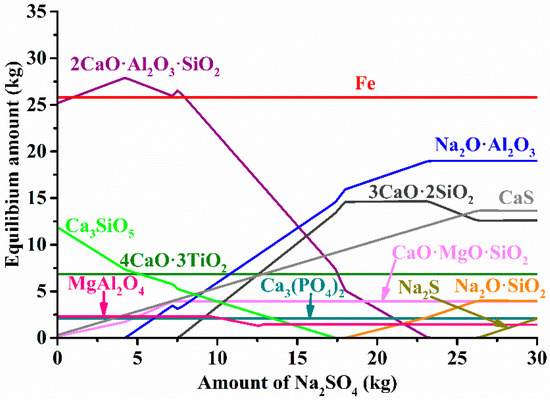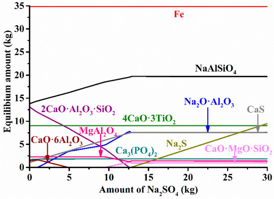 HSC Chemistry 9.9 software (Outotec, Pori, Finland) [64] was used for equilibrium simulation. The calculation was performed at 1100 °C in 100% N2 at pressure of 0.1 MPa for 100 kg of red mud and addition of 40% C (graphite).