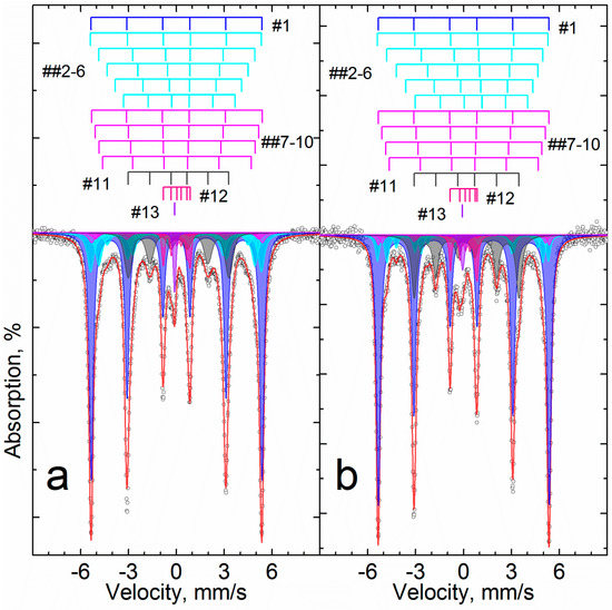 The detailed description of the spectra for the sample U is presented in [67]. The subspectra parameters of the sample B is similar to those of the sample U. The main difference of the B sample spectra is the absence of subspectra 5, 6, and 12. This group of sextets, which is present only in the sample U spectra, lowers the background in the middle part of the room-temperature spectrum, and brings about the shoulder in the resonance lines 1 and 6 of the sextets in the low-temperature spectrum. This group of sextets corresponds to alumogoethite, i.e., goethite [68,69,70], in which part of Fe atoms is isomorphically substituted by Al [71].