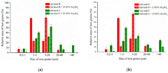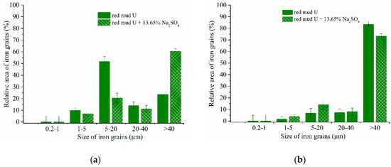 Effect of 13.65% Na2SO4 addition to the red mud sample U on the relative area of iron grains of different fractions after 180 min of roasting at 1350 °C (a) and 1400 °C (b).