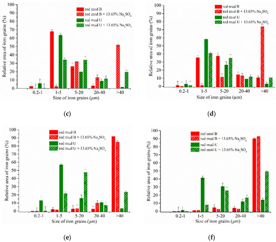 Effect of 13.65% Na2SO4 addition to the samples B and U on the relative area of iron grains of different fractions after 180 min of roasting at 1000 °C (a), 1100 °C (b), 1150 °C (c), 1200 °C (d), 1250 °C (e), 1300 °C (f).