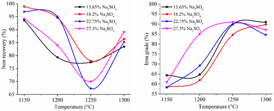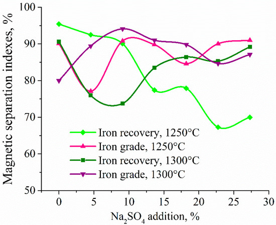 Figure 9 demonstrates the magnetic separation indexes of the roasted sample B with addition of 13.65–27.3% Na2SO4 at 1150–1300 °C; Figure 10 illustrates the microstructure of the roasted sample B obtained at 1150–1200 °C with varied amount of the additive.