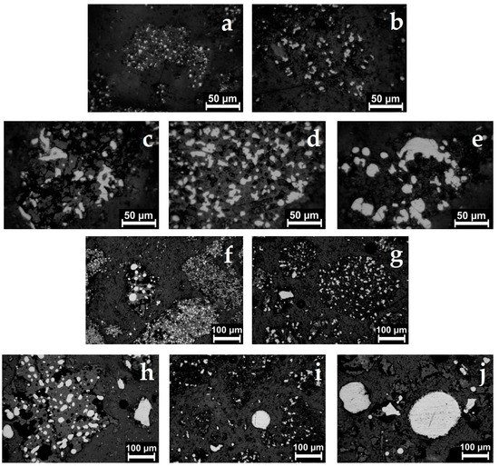 The histograms show that at the range of 1000–1100 °C iron particles are mainly distributed between fractions of 1–20 μm in size (Figure 7a,b). There is a small amount of iron grains larger than 40 μm in the samples of roasted red mud U in contrast with red mud B obtained in the similar conditions. An increase of the roasting temperature to 1150–1200 °C (Figure 7c,d) led to an increase of the grain size in the sample B with addition of 13.65% Na2SO4, where the relative area of iron grains with a size larger 40 μm was more than 50%. It should be noted that in the sample U grains of the fraction larger 40 μm have the relative area about 10–20% under the same conditions. Further rise of the roasting temperature to 1250–1300 °C (Figure 7e,f) caused a significant growth of iron grains for the sample B both with and without sodium sulfate addition, where the relative area of iron grains with a size larger 40 μm is more than 85%. For the sample U roasted at these temperatures the addition of 13.65% Na2SO4 considerably increased the relative area of iron grains with a size larger 40 μm, but it is still half as much as in the sample B.