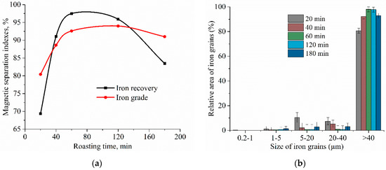 Thus, iron grain size calculations (Figure 7 and Figure 8) correlate with the general magnetic separation results (Table 4). Based on the data comparison, it can be inferred that the main part of iron grains larger than 40 μm predetermines successful magnetic separation of the roasted samples.