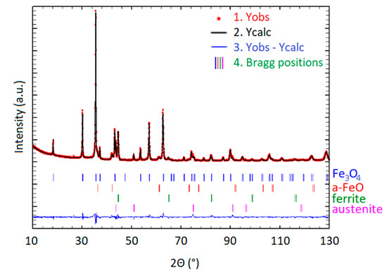The obtained powders were analyzed using the X-ray diffraction method in order to determine the phase composition. The recorded diffraction pattern is shown in Figure 1. Phase analysis using the PDF-4 + ICDD database revealed the whole diffractogram can be described using four phases. The dominant phase is magnetite-like phase (Fe3O4, PDF: 04-013-9807) possessing a cubic structure and space group. Phase composition analysis showed that the studied material also contains cubic wuestite-like phase (α-FeO, PDF: 01-080-3820), ferrite iron like phase (α-Fe, PDF: 04-006-4192) possessing the A2 type of structure, and austenite-like phase (γ-Fe, PDF: 00-052-0512) with A1 type of structure. A detailed analysis based on X-ray diffraction measurements using Rietvield method was performed. The quantitative analysis showed that 74% of the studied material was magnetite-like phase. Detailed data of the experiment is demonstrated in Table 1.