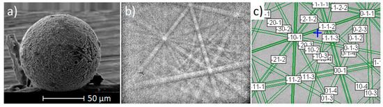 Electron backscatter diffraction (EBSD) measurements of the particle samples: (a) morphology of the selected particle, (b) electron backscatter diffraction patterns, (c) EBSD pattern indexed to the magnetite structure.