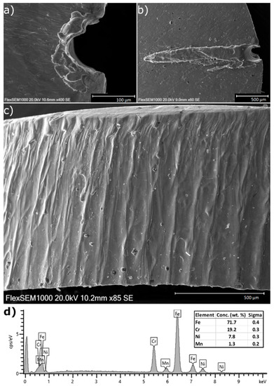 As can be seen in the SEM images, the initial penetration stage can cause a creation of molten material (Figure 3b). This is the reason why the cutting process starts on the outer part of the desired element in order not to affect the surface and the desired dimensions of the final element. The cut surface is clean and smooth with seldom visible melting lines of the material. The process is conducted in the protective gas atmosphere, and due to that, the surface oxidation process is suppressed. The recorded EDS spectra (Figure 3d) show only a slight presence of the oxygen. This is a great advantage of the laser cutting process in protective gas atmosphere due to the possibility to use the final cutting products without the necessity of further chemical or mechanical removal of oxide layers.