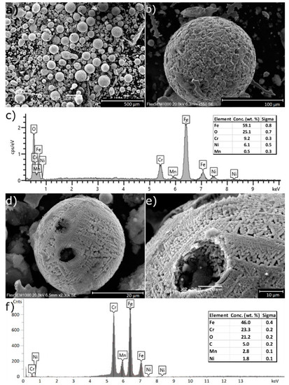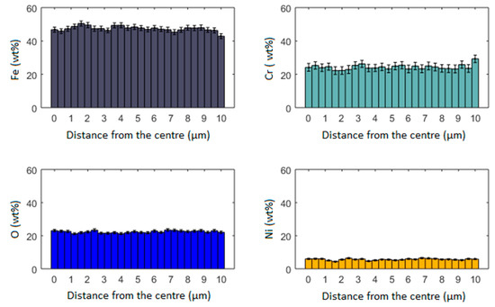 With respect to the results described above, it can be stated that the powder particles are composed mainly of a mixture of a magnetite (Fe3O4) phase. The EDS analysis showed that the obtained particles contain all the chemical elements of the initial steel material (Figure 4c,f). Additionally, the presence of oxygen in the particles is clearly visible. The balls’ oxidation process occurs due to the presence of oxygen outside the protective nitrogen atmosphere when the molten or vaporized material is blown away from the cutting area by a supplied stream of gas.