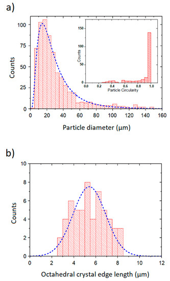 The size distribution of octahedral crystals (octahedrons’ edges) is presented in Figure 5b. For this analysis, 56 particles were taken into account. The crystals edge length distribution can be described as a Gaussian distribution, the Gaussian curve fitting is also shown in Figure 5b. The mean value of octahedron edge length (center of the distribution) is 5.4 (2) μm with a standard deviation of 3.7 (5) μm.