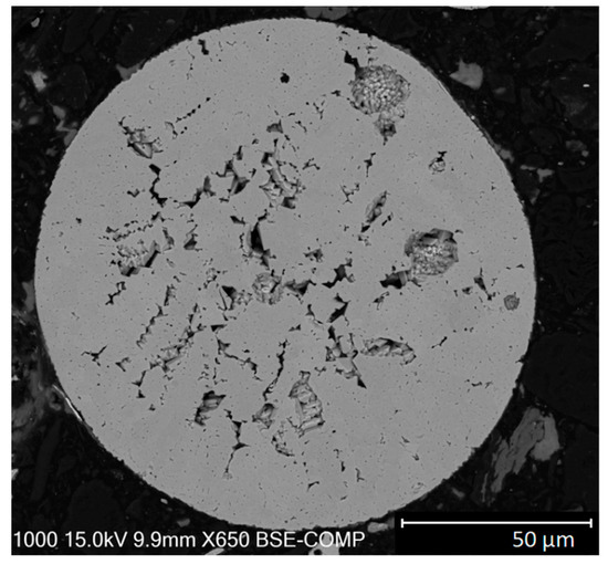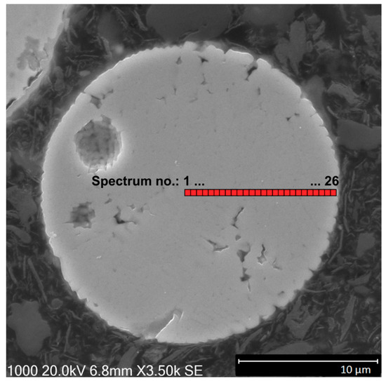 To assess a spatial distribution of chemical elements inside the particles, EDS analysis was done also for microparticle cross-sections. The powder material was mixed with carbon resin and this mixture was thermally hardened and polished in order to reveal the inner structure of the particles. The EDS spectra were taken from various distances from the particle center, as shown in Figure 7. In this case, a total of 26 spectra were taken and elemental compositions of the measured areas were mutually compared. The results for the most abundant elements are shown in Figure 8 (carbon was excluded from the evaluation due to a possible presence of parasitic EDS signals from the carbon substrate). It can be seen that the elemental distribution is fairly uniform. This uniformity was verified by SEM images taken in a backscattered electrons mode (see Figure 9); the uniform intensity of the cross-section shows that there are no fluctuations of elemental content in the bulk. In this figure, a typical crystalline structure with gaps can be seen too.
