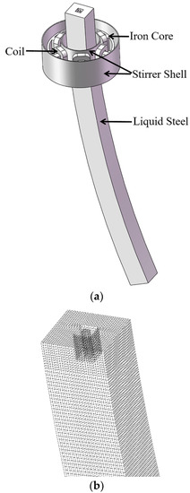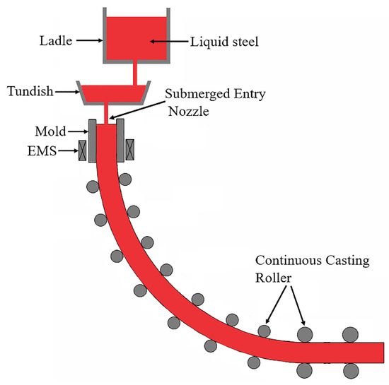 As a vital process in steel production, curved continuous casting is applied in many steel companies because of low-energy consumption, high efficiency and metallic yield [1,2]. During the curved continuous casting process, the liquid steel flows through the ladle and the tundish to the mold, as shown in Figure 1, and the continuous casting billet is formed and cooled gradually after the solidification in the mold. In recent years, the quality requirements of steel products have become increasingly strict for an excellent drawing property, low-temperature toughness and fatigue resistance. Thus, the inclusion content in liquid steel, which has a negative effect on the steel properties, must be reduced to a fairly low level to satisfy the production requirement [3,4,5]. In order to improve the billet quality effectively, mold electromagnetic stirring (M-EMS) has been used to change the fluid flow and promote the inclusion removal in liquid steel in many steel companies [6,7,8,9].