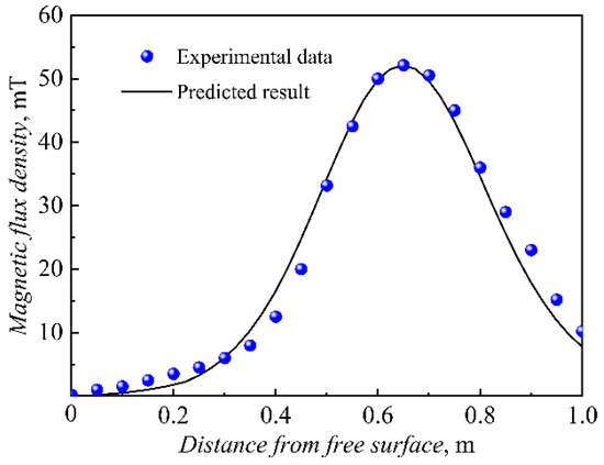 Figure 4 shows that the predicted magnetic flux density agrees well with the experimental data. The magnetic field is measured by the digital Gaussmeter CH-1800 in the actual curved continuous caster. The maximum magnetic flux density along the central axis of bloom is 52 mT when the current is 500 A and the frequency is 2.5 Hz.