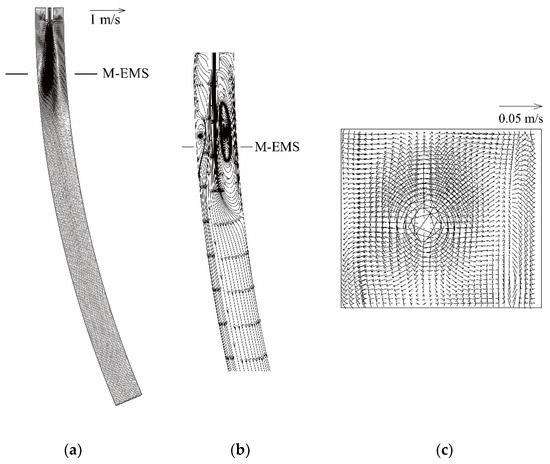 Figure 6 and Figure 7 also give the differences between these flow fields. (1) In the case of no M-EMS, only a small part of the liquid steel returns to the free surface on the inner arc side. (2) In the case of M-EMS, the flow field is close to the symmetrical pattern on the vertical longitudinal-section. (3) The fluid velocity at the free surface in the case of M-EMS is greater than that in the case of no M-EMS. (4) In the case of M-EMS, there are four recirculation zones. Two recirculation zones are above the M-EMS central cross-section, and the other two recirculation zones are below the M-EMS central cross-section. (5) Because of the strong electromagnetic force, the fluid velocity on the M-EMS central cross-section with M-EMS is one order greater than that without M-EMS. (6) In the case of M-EMS, the direction of swirling flow is the same as the direction of rotating electromagnetic force, and the magnitude of the fluid velocity in the case of M-EMS is one order greater than that in the case of no M-EMS.
