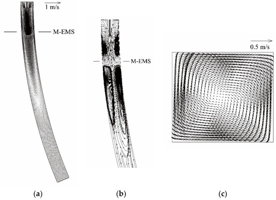 Liquid steel flow in curved bloom continuous caster with M-EMS: (a) vertical longitudinal-section; (b) stream line (enlarged part); (c) M-EMS central cross-section.