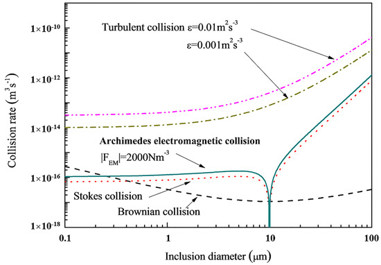 Usually, there are three inclusion collision mechanisms among particles: turbulent collision, Stokes collision and Brownian collision. In the case of an electromagnetic field, there is a fourth collision mechanism: Archimedes electromagnetic collision. The effect of Archimedes electromagnetic force on the inclusion behavior consists of Archimedes electromagnetic slipping velocity and Archimedes electromagnetic collision. Figure 8 gives the contribution of different collision mechanism to the inclusion collision. Turbulent collision is the most important mechanism of collision among inclusions. It is about two orders greater than Archimedes electromagnetic collision and Stokes collision if the inclusion size is less than 10 μm, and it is about one order greater than Archimedes electromagnetic collision and Stokes collision if the inclusion size is greater than 10 μm. With inclusion diameter increases, the difference between turbulent collision rate and Archimedes electromagnetic collision decreases gradually. Brownian collision is the most weakest collision, and the related collision is only about . It should be noted that the Archimedes electromagnetic collision rate and Stokes collision rate is zero if two inclusions have the same size.
