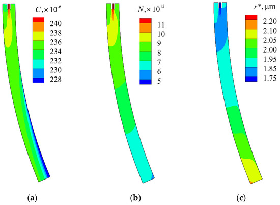 Figure 10 shows that the spatial distributions of the inclusion characteristic radius, the inclusion number density and the inclusion volume concentration are close to the symmetric distribution in the continuous caster in the case of M-EMS because the related flow field is close to the symmetry pattern shown in Figure 7b.