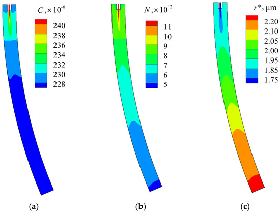 Inclusion distribution at vertical longitudinal-section in curved bloom continuous caster without M-EMS: (a) volume concentration; (b) number density; (c) characteristic radius.