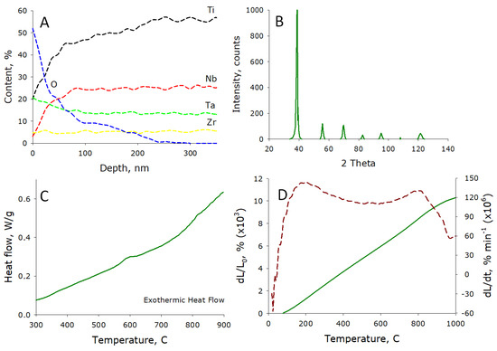 - Sergienko, K.V.; Titov, D.D.; Konushkin, S.V.; Baikin, A.S.; Nasakina, E.O.; Baskakova, M.I.; Bespamiatnova, A. Study of the coefficient of heat expansion of TiNbTaZr alloy. IOP Conf. Ser. Mater. Sci. Eng. 2019, 525, 012092. [Google Scholar] [CrossRef]