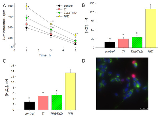 | Materials | LRPS, cpm | [H2O2], nM | [•OH], nM | Nonviable Cells, % | MI, % | Density of Cells, cells/mm2 | Free Surface, % |