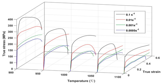 It can be seen from the Figure 2 that the stress–strain curves of Inconel 718 at various temperatures have a close changing trend. In the initial stage of deformation, the flow stress increases significantly with the increase of strain, and the work hardening effect caused by the increase of dislocation density is significant. As the deformation continues, the dynamic softening effect inside the material gradually increases, and the dislocation density begins to show a downward trend. The two effects reach equilibrium at a certain deformation moment, at which time the flow stress will tend to stabilize. Obviously, the level of flow stress is affected by the coupling of temperature and strain rate. Under the same temperature conditions, the deformation resistance of Inconel 718 decreases significantly as the strain rate decreases. This is because the deformation time is shortened and the nucleation number of dynamic recrystallization is reduced under high strain rate, which leads to insufficient dynamic softening process of the material. On the other hand, the increase of temperature promotes the slip and climb of dislocations, thereby it improves the nucleation rate of dynamic recrystallization and promotes the dynamic softening process of the material. This also explains the phenomenon that the flow stress increases significantly with the decrease of temperature under the same strain rate.