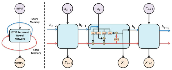 The most notable feature of the LSTM network is that there is a data route that runs through all neuron modules, which is used to transfer the memory state. The memory route is transmitted in parallel with the input–output route of the neuron, and they interact linearly through a specially designed “gate” structure to ensure the stability of the memory information state. Through the “gate” structure, the memory information can be partially deleted or updated, and stored as long-term memory (cell state) and short-term memory (hidden state) by LSTM network. Taking the LSTM network model structure in Figure 4 as an example, when the input value at a certain moment and the memory at the previous moment enter the neuron structure, the forgetting vector that determines the degree of memory retention and is generated through the memory gate is: