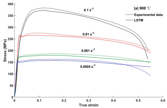 Fitting results of LSTM constitutive model. (a) 900 °C; (b) 950 °C; (c) 1000 °C; (d) 1000 °C; (e) 1100 °C.