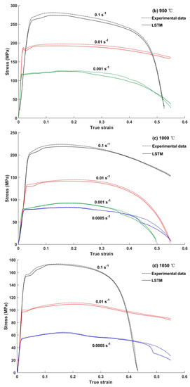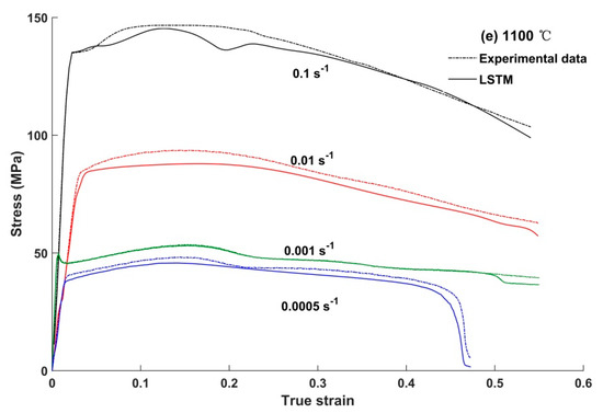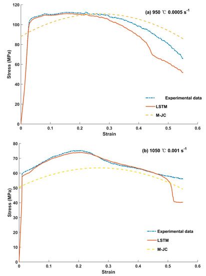 In order to further verify the prediction accuracy of LSTM model, the prediction results at 1000 °C, 0.1 s−1 and 1100 °C, 0.0005 s−1 were compared with the results of M-JC model. The Johnson–Cook model is a typical phenomenological constitutive model, which can effectively characterize the independent effects of temperature, strain rate and strain on flow stress. Taking the coupling effect between deformation conditions into consideration, the modified Johnson–Cook model [26,27] was proposed. It can be expressed as: