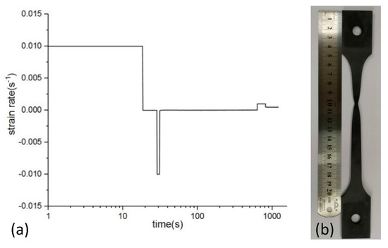 Complex loading tensile test of Inconel 718. (a) Strain rate loading curve; (b) Tensile specimen.